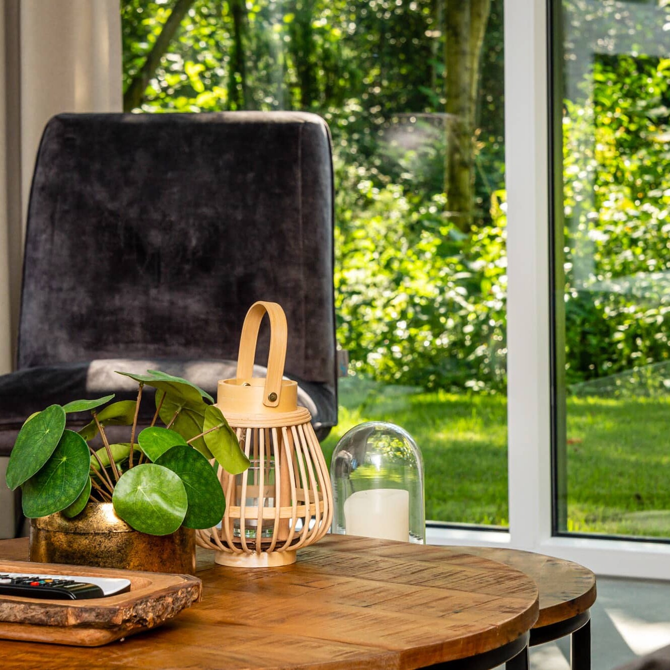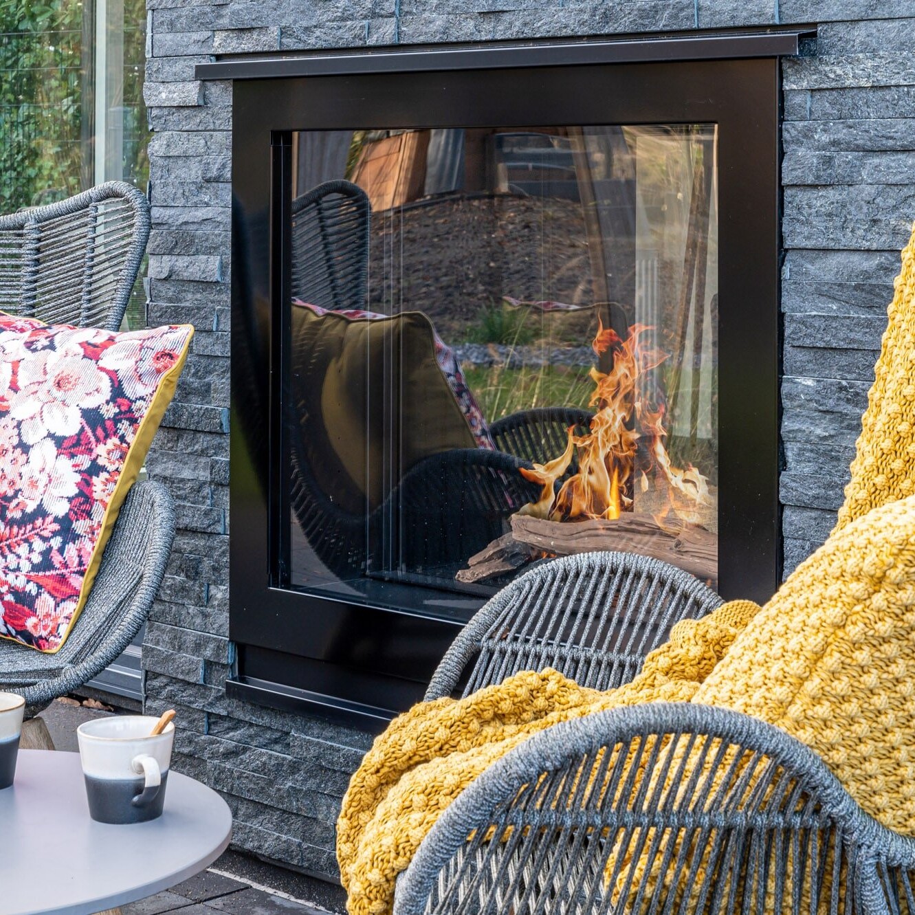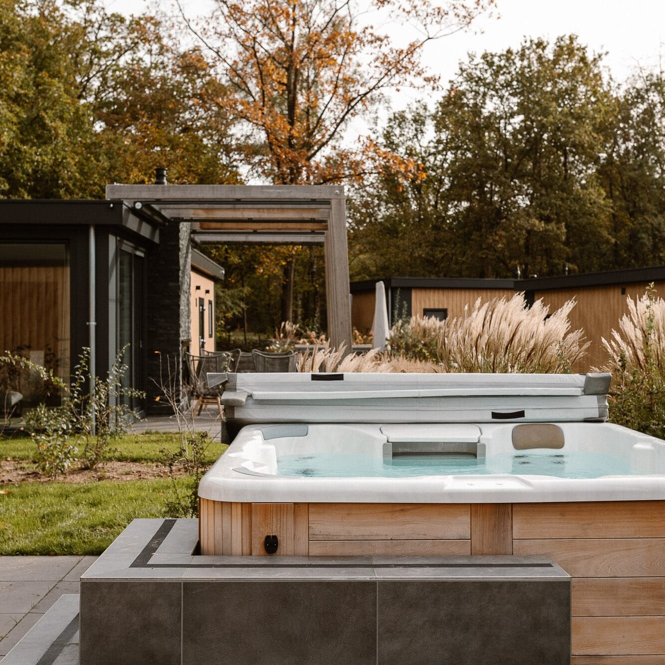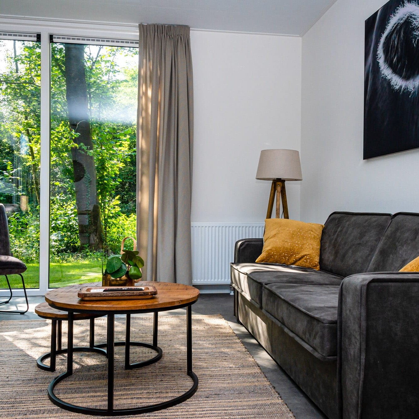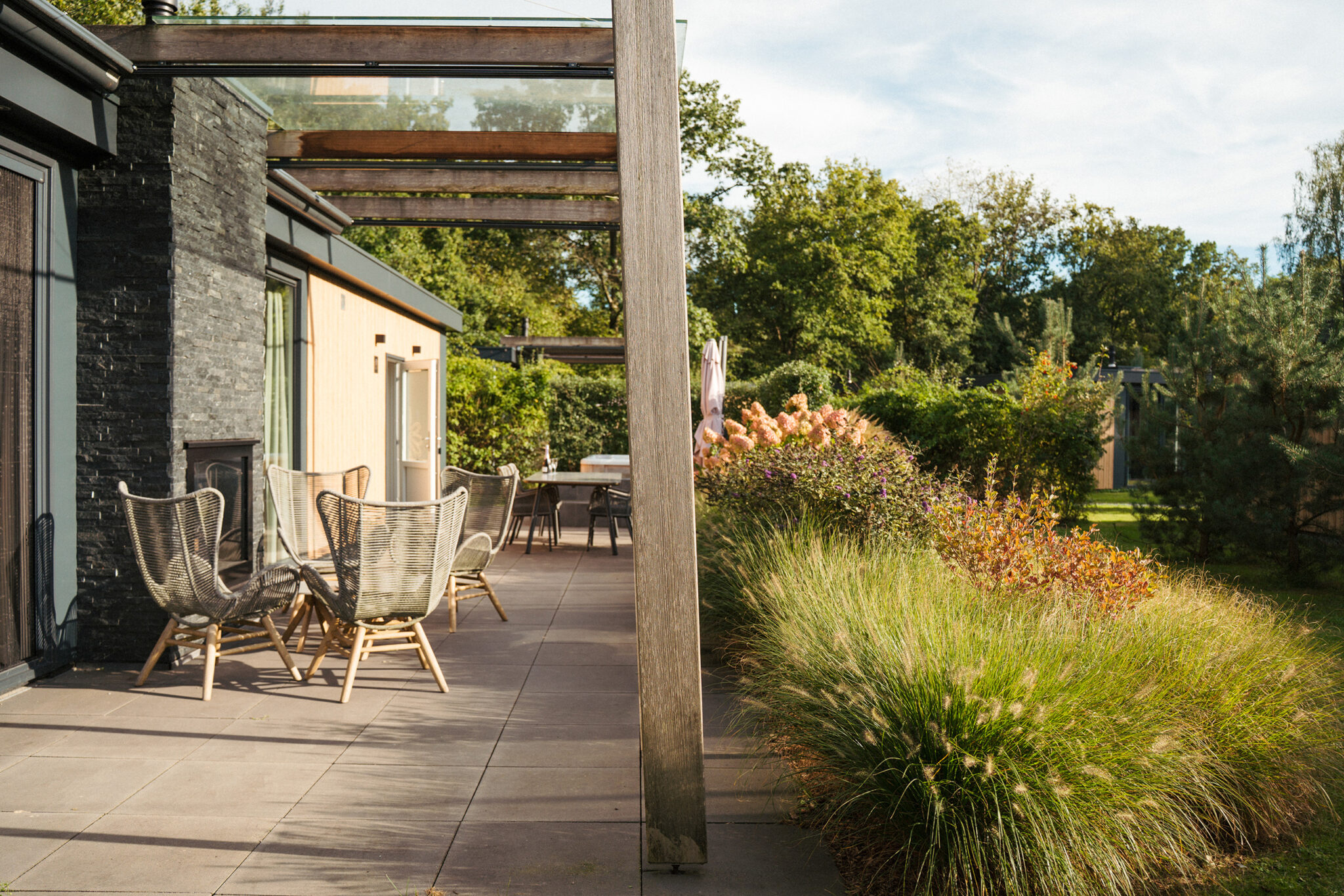 Besonderes Augenmerk wurde auf das Design und die Ausstattung der Lodge, der Terrasse und des Gartens gelegt. Schön auf der Terrasse am Innen-/Außenkamin. Wird es zu kalt? Lass das Feuer brennen und mach mit dem weiter, was du drinnen gemacht hast. Sorgfältig ausgewählte Möbel und Accessoires tragen zum luxuriösen und zeitgemäßen Ambiente der Lodge bei. Deckenstrahler und indirekte Beleuchtung sorgen für eine warme Atmosphäre im Innen- und Außenbereich. Die Lodges sind geräumig und haben raumhohe Fenster. Das Gelände und die Gärten sind teilweise begrünt, was aufgrund der niedrigen Vegetation derzeit etwas weniger Privatsphäre im Spa bietet. Die Wege und Parkplätze werden halbgepflastert sein und sich so in die natürliche Umgebung des Parks einfügen.
